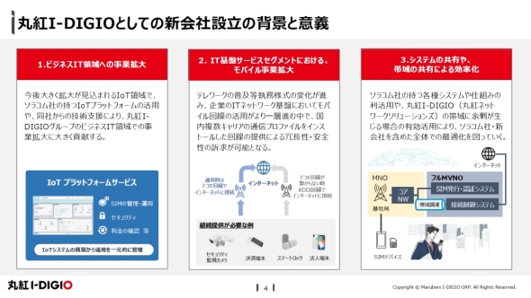 新会社は、丸紅I-DIGIO傘下の丸紅ネットワークソリューションズのMVNO(仮想移動体通信事業者)事業を分社化した上で、ソラコムが51%を出資し同年8月1日から事業を開始する予定である。新会社の社名は現時点では未定だが、本社は丸紅I-DIGIOと同じ住友不動産飯田橋ファーストタワー(東京都文京区)に置くことになる。