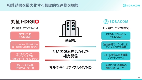 丸紅ネットワークソリューションズのMVNO事業がNTTドコモ回線のフルMVNO事業者であるのに対し、ソラコムはKDDI回線とグローバル回線のフルMVNO事業者である。ソラコム 代表取締役社長の玉川憲氏は「新会社はNTTドコモ、KDDI、グローバルというマルチキャリアのフルMVNOのサービスを提供できる。また、丸紅ネットワークソリューションズがヒト向け/オンプレミスを事業の中核としているのに対し、ソラコムはモノ向け/クラウドベースという違いがあり、互いの強みを生かした補完関係による相乗効果を生み出せると考えている」と強調する。
