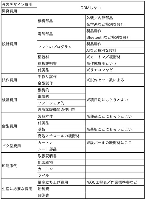 新たな製品であれば、QC工程表と作業標準書は新規で作成する必要がある。治具と装置に関しては、ODMメーカーが所有しているものが使えない場合、治具は新しく作製し、装置は新たに購入しなければならない。よって生産には、量産立ち上げ費用(QC工程表、作業標準書などの書類作成費用)、治具費用、装置費用が必要となる。