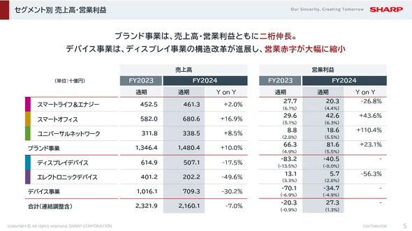 シャープブランドで展開するブランド事業の3セグメントが全て増収だったが、デバイス事業の売り上げ減少で全体としては減収となった。一方、営業利益/経常利益/最終利益はディスプレイの構造改革の進展が貢献して黒字化し、大きく改善した。ブランド事業は売上高が前年度比10.0%増、営業利益が同23.1%増で2桁成長だった。
