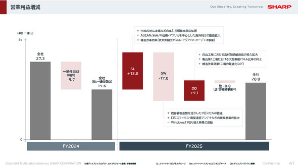 暮らしにかかわる「スマートライフビジネスグループ」は生成AI(人工知能)対応家電の拡販や海外での売り上げ増加、構造改革などの効果で130億円の増益と計画している。Windows 11の切り替え特需の反動減などが見込まれる「スマートワークプレイスビジネスグループ」は170億円の減益。ディスプレイデバイス事業は高付加価値商品の投入拡大や大型車載ディスプレイの販売比率向上、構造改革により71億円の増益を見込んでいる。
