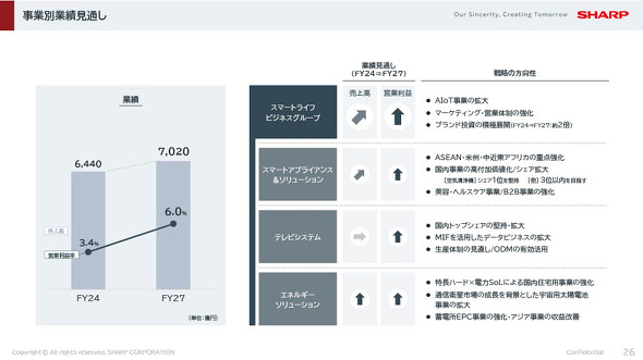 グローバル化に向けて、ブランド事業は2つのビジネスグループに再編する。暮らしにかかわる「スマートライフビジネスグループ」は、スマートアプライアンス&ソリューション、テレビシステム、エネルギーソリューションなどの事業が属する。強みを生かせる領域にリソースを集中させながら、他社との協業も活用してシャープブランドをグローバルに展開していく。IoT(モノのインターネット)機器群による多面的なデータを活用したビジネスモデルへの転換も図る。