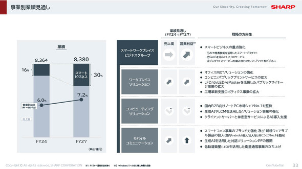 ワークプレイスビジネスグループでは、ノートPCやスマートフォン、複合機などの既存商品の商品力向上やラインアップ拡充に取り組み、販売やサービスも強化する。また、M&Aを活用し、欧米でのマネージドプリントサービスの強化やオフィス全体に向けたライフサイクルマネジメントの連携商材拡大、議事録作成支援など独自AIを活用したDX(デジタルトランスフォーメーション)ソリューションなどを重点的に強化する。小売業向けのDXサービス、物流拠点のスマート化、衛星通信事業への参入などにも力を入れる。