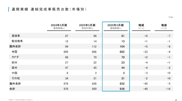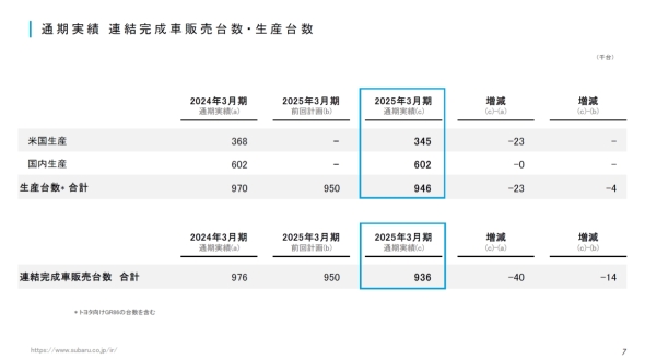 SUBARUの2024年度の連結販売台数は前年度比4.1%減の93万6000台、生産台数は同2.4%減の94万6000台。海外市場における在庫適正化に向けた生産/出荷調整を進めたもののおおむね前期並みの実績となった。国内市場で新型「フォレスター」や「アウトバック」を中心に販売台数が伸び、2024年12月に導入した「クロストレック ストロングハイブリッド」も好調だった。米国市場の出荷台数は前年度比で減少したものの、小売販売は好調で2025年3月時点で32カ月連続前年超えを記録している。カナダ市場も好調で出荷台数が前年度を上回り過去最高を記録した。