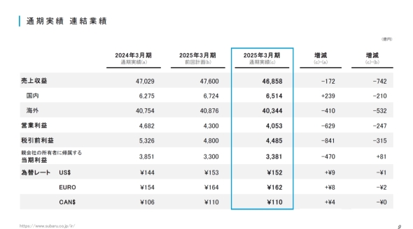 SUBARU(スバル)が2024年度(2025年3月期)連結業績と2025年度連結業績見通しを発表。米国の関税政策の動向など事業環境が不透明なことから2025年度連結業績見通しは未定としたものの「まずは営業利益1000億円レベルを狙う」(同社 代表取締役社長 CEOの大崎篤氏)とした。