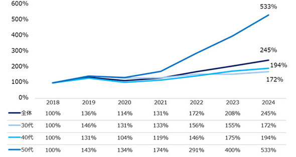 2024年の転職者数は、2018年と比較して2.45倍に増加した。世代別に見ると、30代は1.72倍、40代は1.94倍に増加。50代は特に多く、5.33倍増加していた。