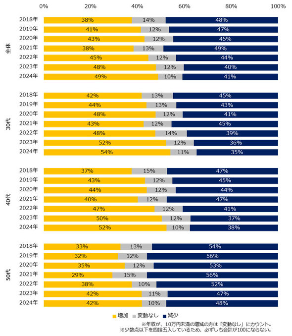 転職前後の年収変動については、転職後に年収がアップした人の割合が増加傾向にあった。2024年は、年収が「増加」したと回答した人が49%となり、2018年の38%から11ポイントアップしている。また、50代は年収が下がるケースが多いとされるが、42%が「増加」したと回答。2018年の33%から9ポイントアップしている。