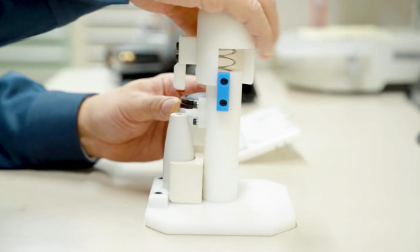 無償開放される特許技術の1つとして「捺印(なついん)治具」がある。これは製品やワークにロット番号を捺印する際、従来の治具では位置ずれや押し方にばらつきが発生していたものを均一化するものだ。基台上に捺印対象物とインク台を固定し、作業者の回転操作で捺印部を対象物側とインク台側に回転往復させながら、押圧操作で捺印できる仕組みとし、ばらつきを抑え、安定した作業を可能とした。