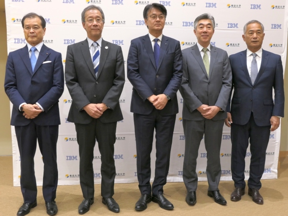 会見の登壇者。左から、東京大学 理事・副学長の相原博昭氏、同大学 総長の藤井輝夫氏、日本IBM 代表取締役社長の山口明夫氏、同社 取締役副社長執行役員 最高技術責任者 兼 研究開発担当の森本典繁氏、QII 会長の小柴満信氏[クリックで拡大]東京大学 総長の藤井輝夫氏は「今回、156量子ビットへの拡張とMiyabiとの接続には大きな意味がある。近年は気候変動をはじめ、国際戦争や貧困、感染症などの地球規模の問題、未曽有の困難が顕在化しているが、これらの課題は既存の手法や体制だけでは解決できず、新たな発想や学知を生かしていくことが必須のものとなっている。量子コンピューティングは新たな知に裏打ちされた技術であり、これまで手掛けられなかった未踏の問題に挑むことを可能にするものだ。東京大学は今後も量子科学の学理探求を進めて、その社会実装に貢献していきたい」と語る。