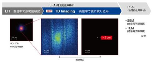 PHEMOS-Xシリーズは、1台の装置にLITとTD Imagingの両方の検出器を搭載できるため、LITで広範囲の信号を検出してからTD Imagingで2μm範囲まで絞り込める。生成AI(人工知能)用半導体など、先端半導体デバイスの故障原因を特定する確率も向上する。
