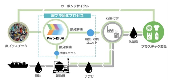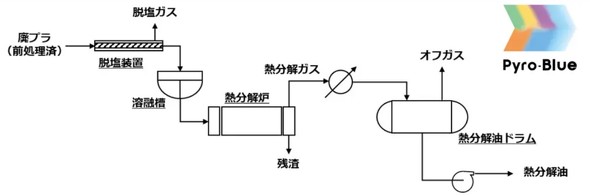 Pyro-Blueは、旧札幌プラスチックリサイクル製の廃プラスチック油化装置をベースに、日揮グループが技術改良した油化プロセス。同プロセスは、塩化ビニール(PVC)とポリエチレンテレフタレート(PET)が混ざった廃プラスチックの処理が可能な他、残渣を適切に排出することで安全かつ連続的な運転を実現する。