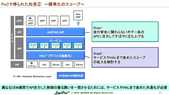 Step2では、JASPAR APIよりも下層のミドルウェアに当たるサービスやHAL(ハードウェア抽象化レイヤー)まで含めて、より深いAPIまで標準化のスコープを拡大することを検討する。異なる自動車メーカー間でAPIを介した制御の振る舞いを一致させるためには、このStep2のレベルまで踏み込んだ標準化が必要になる。ここまで標準化できれば、上層のアプリケーション開発がさらに容易になり、サードパーティーの参入も促進できるだろう。