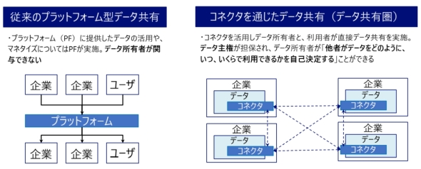 データ共有圏はデータスペース(Data Space)とも呼ばれている。データの共有/交換は、従来はプラットフォームを介したデータ共有が一般的であり、提供されたデータの活用やマネタイズについてはプラットフォーム側が実施し、データ所有者は関与できないものだった。