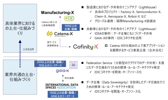 その土台の上に、自動車業界ではCatena-X、製造業全般においてはManufacturing-Xなど業界ごとの仕組みづくりを担う組織の活動が位置付けられる。後述するCofinity-Xは位置付けが他と異なり、Catena-Xの仕組みの上で個別のソリューションを展開するサービス企業となる(図2)。