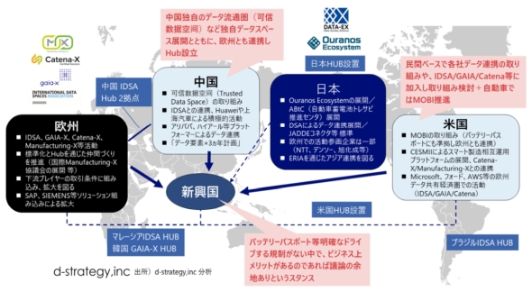 本記事においては、欧州でデータ連携を進める組織とも関連して動く、米国/中国の取り組みについて紹介したい。米国/中国においては、それぞれでデータ連携を行う仕組みの開発や展開が進むとともに、欧州のデータ共有圏の取り組みとの相互接続/連携が進んでいる構造だ(図3)。