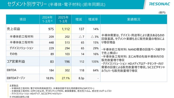 セグメント別では、半導体/電子材料セグメントの売上高は前年同期比14%増の1112億円で、コア営業利益は同135%増の196億円となった。同セグメントでは、半導体前工程材料事業は、NAND需要の回復ペースが緩やかなことから売上高は横ばいに。半導体後工程材料事業は、主にAI(人工知能)関連で引き合いの強い先端半導体向け材料の販売数量増加により増収となった。デバイスソリューション事業は、HDメディアがデータセンター向け需要の回復により増収、シリコンカーバイド(SiC)エピタキシャルウエハーも販売数量の増加で増収した。