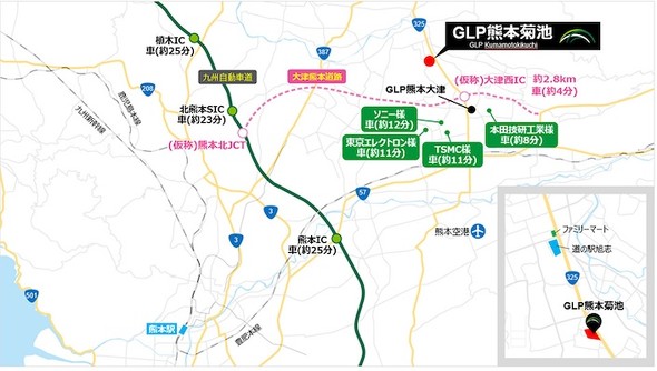 同施設は、TSMCやソニー、東京エレクトロンなどが集まる半導体工業団地の近隣に位置する。九州経済の成長をけん引する重要地域であり、原材料や部品、精密機械を保管する先進的物流施設へのニーズが高まっている。国道325号線沿いで、新設の自動車専用道路「大津西IC(仮称)」からは約2.8km、熊本空港からは約12km、九州縦貫自動車道「熊本IC」からは約15kmの場所にあり、九州全域をカバーする広域配送の拠点として優れる。