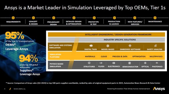 自動車業界においては、世界の主要OEMの95%、サプライヤーの94%がAnsysの製品を導入しており、「設計初期から製品検証に至るまで、製品開発ライフサイクル全体をAnsysが支えている」(ナイル氏)という。