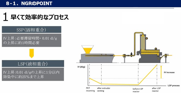 「早くて効率的なプロセス」に関して、他社のPET樹脂再生装置で採用されている固相重合(SSP)はIV値の上昇で必要な滞留時間は0.01dl/gで約1時間だが、LSPの場合は0.01dl/gのIV上昇を1分以内に行える。さらに、IV値の上昇と並行して除染も実施できる。