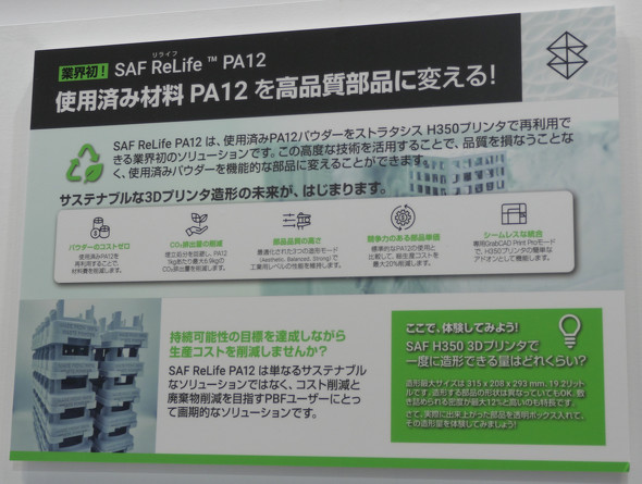 「従来であればかなりの量のPA12を、コストをかけて廃棄せざるを得なかったが、H350とSAF ReLife PA12の組み合わせにより、使用済みPA12の再利用が可能となった。これにより、材料コストの削減だけでなく、サステナブルな3Dプリンタ運用の実現に貢献できる。他の装置などでPA12を使用している現場に対し、有効な課題解決手段として提案したい」(説明員)