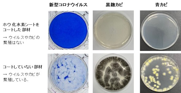 また、黒麹カビや青カビを付着させた場合は、24時間後に生存カビ胞子数が検出限界値以下となる。これらの実験結果から、ホウ化水素シートが菌やウイルス、カビのいずれに対しても抑制する効果を発揮することが示唆された。