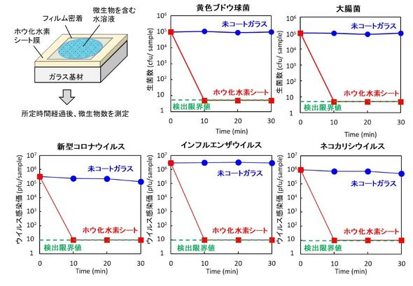 赤外分光法やアルカリホスファターゼを用いた酵素活性試験の解析により、ホウ化水素シートのタンパク質を変性させる特性により、菌やウイルスが不活化したと考えられる。
