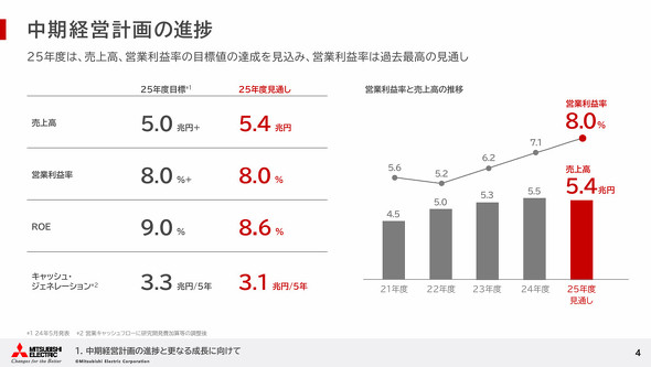 2025年度(2026年3月期)については順調に推移し、三菱電機 代表執行役 執行役社長の漆間啓氏は「売上高と営業利益で目標値の達成を見込み、営業利益率は過去最高となる見通しだ」と述べる。