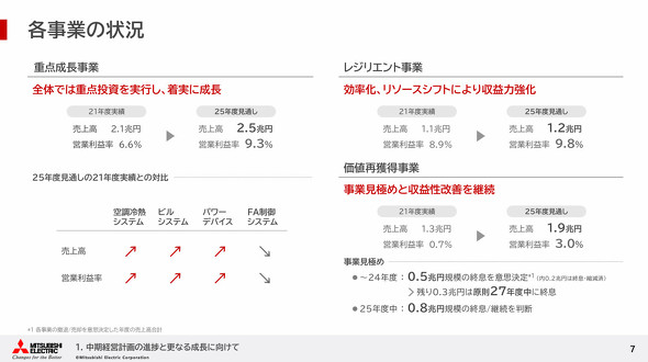 これらを含む価値再獲得事業では、事業の見極めと収益性改善を推進する。具体的には、これらを対象として2025年度中に8000億円規模の事業を終息するのか、継続するかについて、見極めていく。漆間氏は「全てを終息するわけではないが、三菱電機内でのシナジーや今後の事業見通しなどを含めて、必要かどうか見極めていく。その中で、ベストオーナーとしての視点で、外部のパートナーと組んだ方がよければその方向性を模索する。それでも難しい場合は終息や撤退も検討する」と考えを述べている。