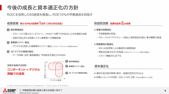 三菱電機は経営戦略について説明した。構造改革として2025年度中に8000億円規模の事業見極めを行う方針を示した他、今後3年をめどに1兆円をかけて新たなM&Aを進める計画などを明らかにした。
