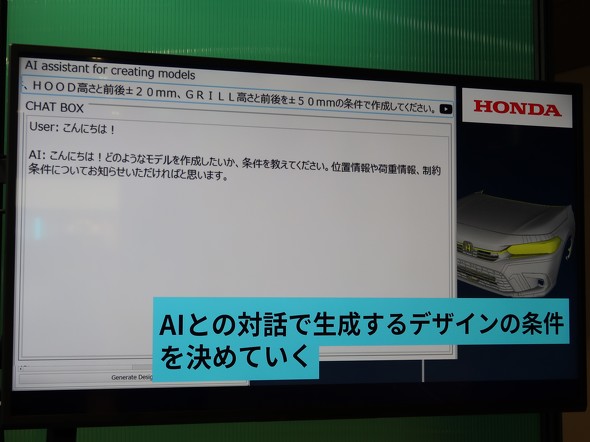 「デザインも制約条件も人間の意思で決める。デザイナーや設計者が困っていたプライオリティの低い作業を自動化し、やりたい仕事を残すという考えでシステムを構築した。デザイナーや設計者の役割をAIに置き換えるためのものではない。また、現場の困りごとを解決するのが目的なので、開発スピードのために最初からデザインをAIに出力させることも考えていない」(ホンダの担当者)