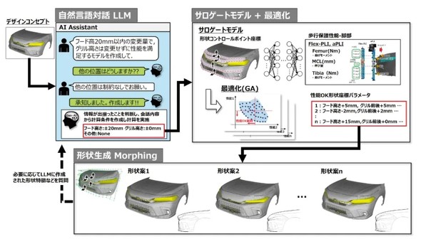 この取り組みは、AIとの対話からユーザーの要求を抽出するLLM(大規模言語モデル)、歩行者保護性能を評価するサロゲートモデルと最適化技術、形状を作成するモーフィング技術の3つを連携させることで実現した。サロゲートモデルをソルバーとした最適化技術とモーフィングでの形状変更で高速に処理を行い、AIに指示するだけで複数のデザイン修正案が作成される。