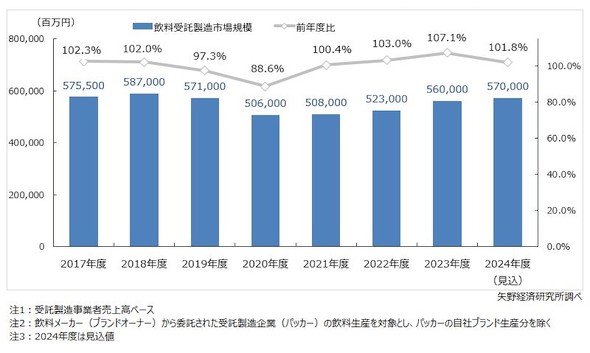 同社によると、2023年度の市場規模は前年度比7.1%増の5600億円、2024年度は同1.8%増の5700億円に達する見込みで、4年連続の成長となる。同社は2023年度の成長要因として、猛暑により飲料需要が増えたことに加え、ブランドオーナーの多くが加工賃単価の引き上げを容認したことを挙げ、製造量自体は微増にとどまると推察している。