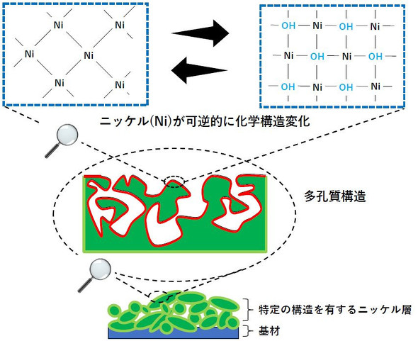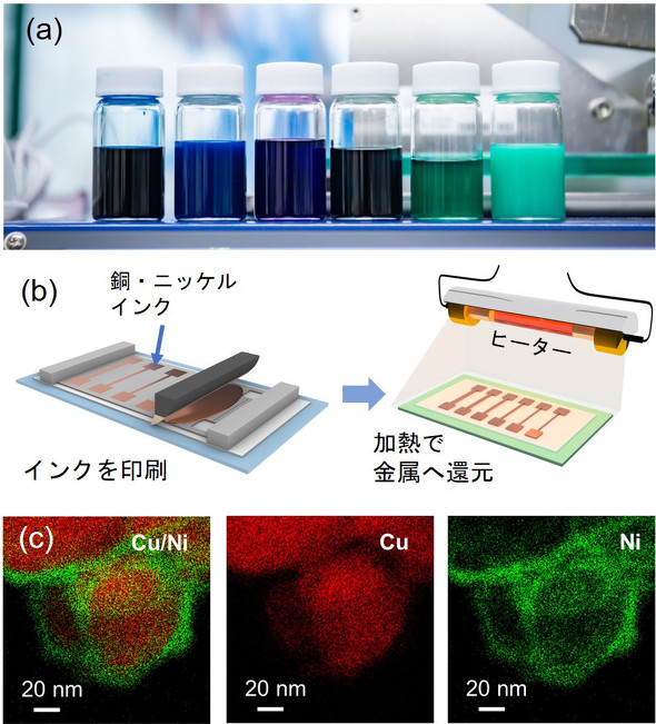 銅は安価で導電性に優れるが、酸化されやすい弱点があり、インク化した際の保存安定性や、印刷後の導電性維持が課題となっていた。今回の発明では、大気下でも安定した銅錯体にニッケル錯体を添加することで、加熱還元後に銅配線をニッケルが自発的に被覆する銅/ニッケル錯体インクを開発した。導電性を担う銅は大きな粒子が、表面を覆うニッケルは緻密な膜が析出する機構を実現し、高い導電性と耐酸化性を両立した。