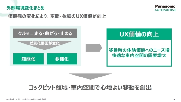 永易氏は「知能化と多様化が進むことで、自動車の差別化ポイントは従来の走る、曲がる、止まるといった走行性能から変化しており、移動時の体験価値や快適な車内空間を求めるUX価値の向上へのニーズが高まっている。そこで、これまで培ってきたくらしや人に寄り添う技術を生かして、コックピット領域と車内空間で心地よい移動を創り出していくことに貢献していきたい」と述べる。