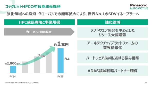 コックピット領域では、SDV化が進む中で自動車のアーキテクチャがソフトウェアを中心に、CDC(コックピットドメインコントローラー)を経て統合HPC(高性能コンピュータ)化に進化するトレンドを捉え、車載のセンサーやアクチュエーターとクラウドの双方と連携する「コックピットHPC」を開発する。現在、コックピット領域の売上高は約2800億円だが、10年後の2035年度には1兆円まで拡大させたい考えだ。そのために強化すべき施策として、ソフトウェア開発を中心としたリソースの大幅増強、アーキテクチャ/プラットフォームの業界標準化、ハードウェア技術における強みの構築、ADAS(先進運転支援システム)領域での戦略パートナー確保を挙げた。「ADASや自動運転技術が進化していけば、それらのシステムから得られる情報をコックピット側で出していく必要がある。そのために適切なパートナーを見極めていきたい」(永易氏)。