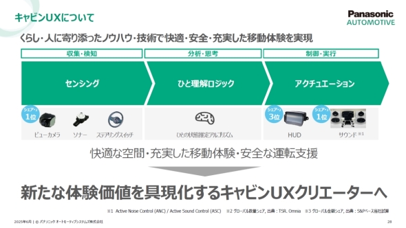 車内空間については、ディスプレイオーディオやIVIなどの個別機能の価値から、空間全体として快適さを満たす空間価値が求められるようになっていくと想定している。そして、これまでパナソニックグループ傘下で培ってきた、くらしと人に寄り添ったノウハウ/技術により、センシングとアクチュエーションを「ひと理解ロジック」によってつなげ、一人一人に合わせた移動体験価値を創造する「キャビンUX」を具現化していく。キャビンUXでは、既に自動車メーカーとの共創をスタートしており、展示会でのコンセプト訴求を通してモビリティサービサーからの引き合いも得ているという。車内空間と関わる事業の売上高はコックピット領域と同程度だが、将来的な目標については「より具体化する中で決めていきたい」(永易氏)としている。