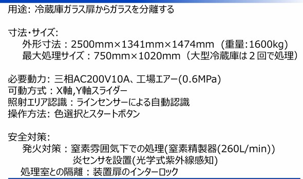 新装置ではレーザー剥離工法を維持しつつこれらの課題を解消している。新装置は搭載されたガラスステージにガラス扉を乗せ下からレーザーを照射する構造を採用している。これにより、ガラスステージにガラス扉を乗せるだけで最適な面出しが行えるようになっている。