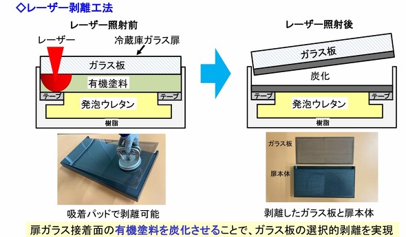 従来装置は扉ガラス接着面の有機塗料をレーザーにより炭化させた後、吸着パッドで取り外すことによりガラス板の選択的剥離を実現する「レーザー剥離工法」を採用している。一方で、対象物の上からレーザーを照射するため毎回あらかじめガラス扉の面出し(レーザーが効果を発揮するために対象物の水平性や高さ、位置を調整する作業)が必要だった。さらに、ガラス扉の色調や光沢の違いによってセンサーが画像認識エラーを起こしサイズを正確に測れずレーザー照射範囲を規定できないケースや、レーザー照射によるウレタン燃焼のリスクがあった。
