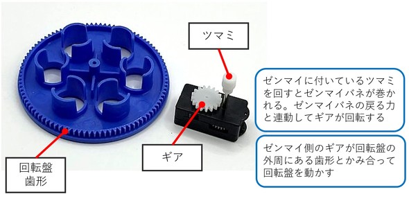 ゼンマイ部分には連動して動くプラスチックギアが配置されており、このギアと回転盤の外周に付いている歯車の歯形がかみ合い、ゼンマイバネの戻る力を利用して、一定速度で回転盤を動かします(図4)。回転動作は非常にスムーズで、途中で急に止まったり、速くなったりすることはなく、安定した動作を実現しています。