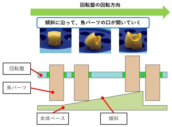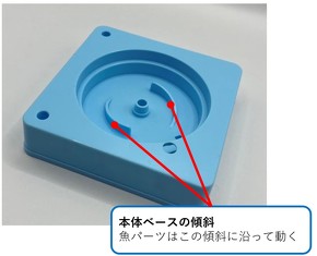 その代わりに使われているのが、本体ベースに設けられた傾斜です(図5)。これは波形カムのような役割を果たしており、魚パーツの底面にある軸がこの傾斜に沿って上下することで、魚の頭部が傾き、口が自然と開閉する仕組みになっています。