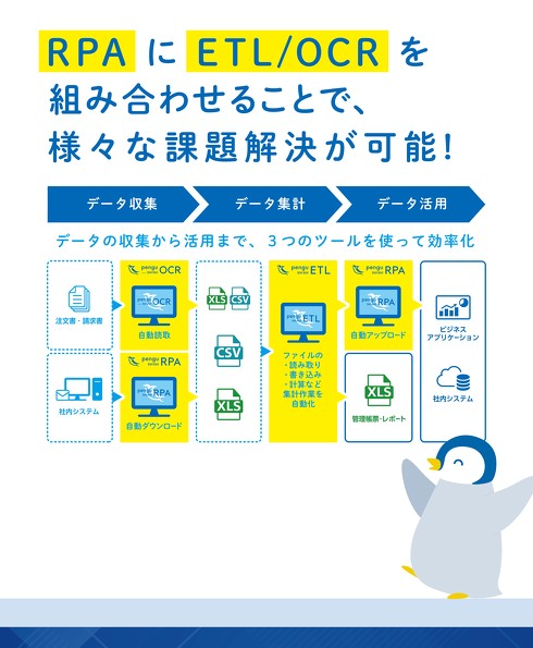 penguは、PC操作を自動で行うRPA(ロボティックプロセスオートメーション)、手書きも高精度で読み取るOCR(光学文字認識)、Excel処理を簡単に実装できるETL(データの抽出、変換、ロード)の3ツールを統合。業務に応じて柔軟に組み合わせることで、紙の帳票転記からデータ入力まで幅広く対応可能だ。