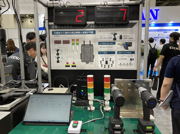 パナソニック エレクトリックワークス社は、製造組み立て現場向けのツールとして、協働ロボットに対応したインパクトレンチ「ロボテックインパクト」を出展した。従来、締結作業は熟練作業者の“手の感覚”に頼る部分が大きく、標準化や脱属人化が課題とされてきた。同社の新製品は、ロボットの先端に装着し、狙いのトルクを設定してボルトを自動締結することが可能だ。