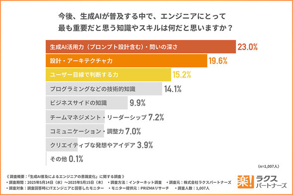 「今後、生成AIが普及する中で、エンジニアにとって最も重要だと思う知識やスキル」のトップ3は、1位が「生成AI活用力(プロンプト設計含む)、問いの深さ」(23.0%)、2位「設計、アーキテクチャ力」(19.6%)、3位「ユーザー目線で判断する力」(15.2%)だった。
