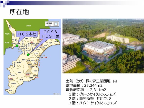 GCSのリサイクル工場は土気(とけ)緑の森工業団地内にあり敷地面積は2万5344m2で、建物面積は1万2311m2となっている。生産エリアは8000m2で、倉庫などその他のエリアは4000m2だ。60人の従業員が所属している。