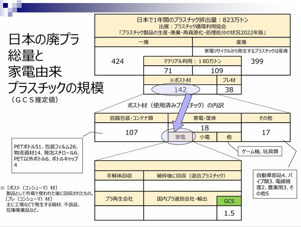 823万tのうち素材として再利用されるものは180万tで、内訳は一般廃棄物が71万t、産業廃棄物が109万tとなる。180万tのうち、142万tは製品として市場で使われた後に回収されたポスト材で、38万tは主に工場などで発生する端材、不良品、在庫廃棄品などのプレ材となる。ポスト材の内訳は、容器包装/コンテナ類が107万tで、家電/筐体が18万t、自動車部品などのその他が17万tとなる。当社の推定値によれば、家電/筐体の18万tのうち1.5万tをGCSが再資源化している。