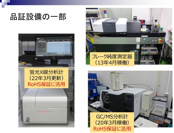 筒井氏 製品品質を保証する設備としては、フレーク純度測定機やガスクロマトグラフ質量分析計(GC/MS)、蛍光X線分析計を備えている。フレーク純度測定器はリサイクル工場で生産した再生PPやPS、ABSのフレークの純度を測ることに活用している。GC/MSと蛍光X線分析計は、RoHS認証に対応するために保有している設備で、これらによりリサイクル工場の生産品に対して、RoHS指令で規制されている有害物質などの含有濃度を計測している。特定臭素系難燃剤やフタル酸エステルの残留濃度はGC/MS分析計による抜取り検査で確かめている。