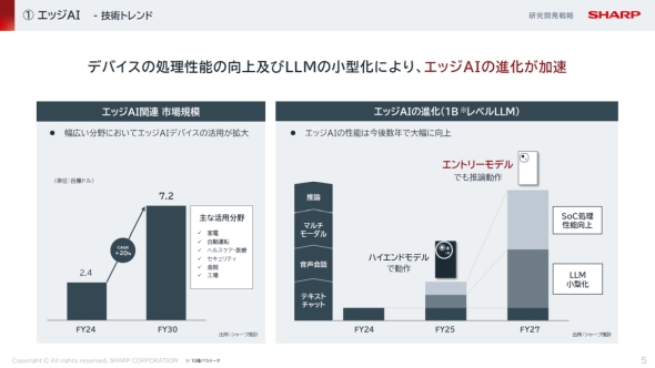 クラウド上での運用が一般的だったAIだが、PCやスマートフォン、IoT(モノのインターネット)機器といった現場側のエッジデバイスにAIモデルを組み込んで運用するエッジAIの採用が拡大している。シャープの推計によれば、エッジAIの市場規模は2024年度の2400億米ドルから年率20%で拡大して2027年度には7200億米ドルまで増加するという。