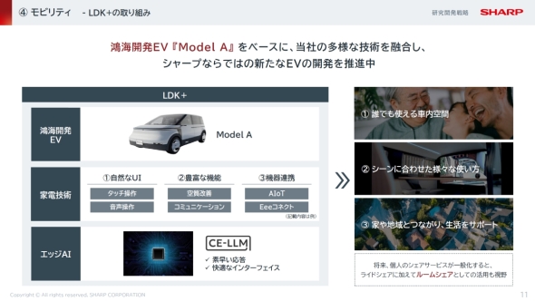 なお、CE-LLMを適用した商品やサービスとしては、2025年2月発表の会議の議事録を自動で作成する「eAssistant Minutes」、同年5月発表のホテル向け対話型コンシェルジュサービス「eAssistant Concierge」、6月発表のオーブンレンジ「ヘルシオ」向けサービス「クックトーク」などを展開している。また、シャープが開発を進めているEV(電気自動車)コンセプト「LDK+」にもCE-LLMを適用し、快適な車室内空間におけるAIの素早い応答や快適なインタフェースの実現に役立てる方針である。