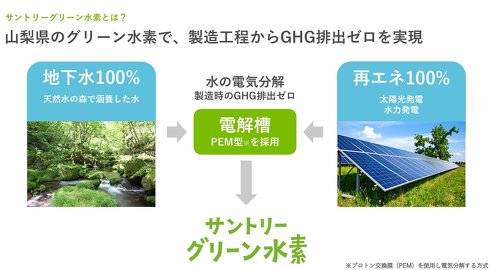 サントリーホールディングスは2025年6月11日、東京都内とオンラインで記者会見を開き、プロトン交換膜(PEM)を使用し電気分解するPEM型電解槽を備えた「やまなしモデルP2Gシステム」を活用し生産する「サントリーグリーン水素」の製造規模を発表しました。では、利用するやまなしモデルP2Gシステムにおける24時間365日フル稼働時の水素製造能力はどのくらいでしょうか。