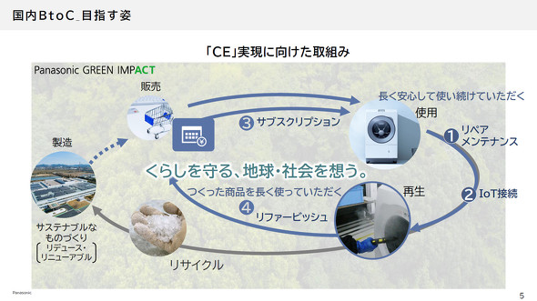 そして、サーキュラーエコノミーの実現に向けた取り組みとして、国内のB2C事業向けには「長く安心して使い続けていただく」「作った商品を長く使っていただく」を進めている。